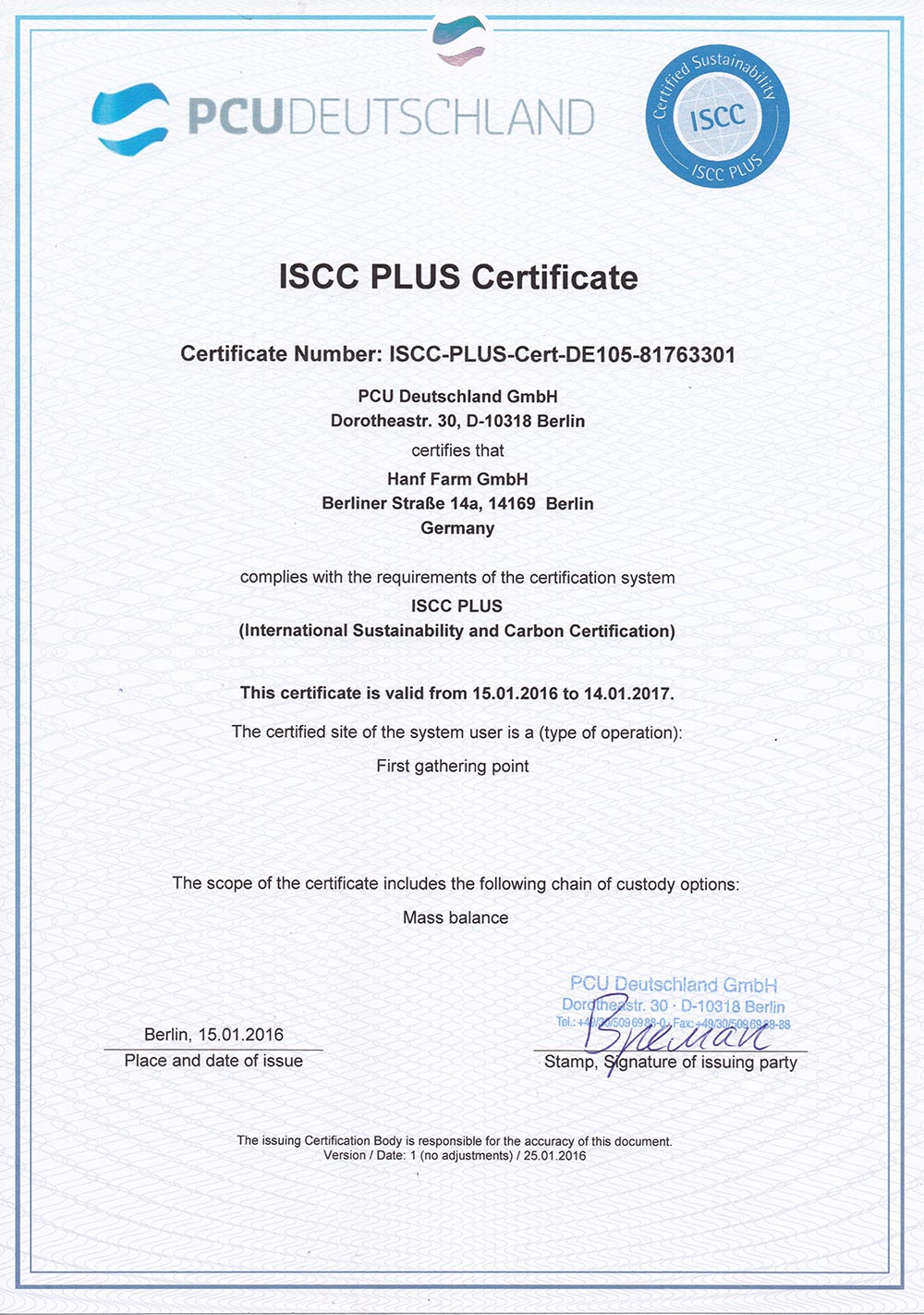 Im Juni 2016 erhielt nun das niederländische Unternehmen HempFlax Exploitatie, Oude Pekela, das Nutzhanf anbaut und verarbeitet, das Nachhaltigkeitszertifikat für Hanfstroh und ‑fasern (ISCC-PLUS-Cert-DE110-75160108). Für die zweite Produktionsstätte von HempFlax in Rumänien wird die Zertifizierung im nächsten Jahr folgen.